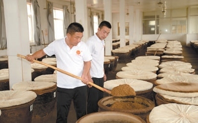 一旁,28歲的學(xué)徒李君正把缸里的醋醅翻到另一個(gè)醋缸之中。這是為了降溫而進(jìn)行的“打平翻缸”操作,要持續(xù)15天時(shí)間?!八螏煾嫡f,發(fā)酵環(huán)節(jié)最難掌握的就是溫度的控制和時(shí)機(jī)。”以前種地為生的李君,已經(jīng)跟著宋俊鵬學(xué)了5年釀醋,一個(gè)月有將近4000元的收入,“學(xué)會獨(dú)門技藝,咱也是手藝人了!”