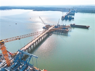 江西省南昌市南昌縣昌南大橋項(xiàng)目施工現(xiàn)場,工人在加緊推進(jìn)橋梁承臺和引橋建設(shè)。