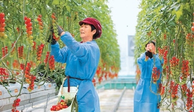 近年來,江蘇省南通市通州區(qū)大力推動智慧設(shè)施農(nóng)業(yè)、生態(tài)高效農(nóng)業(yè)園區(qū)發(fā)展,促進(jìn)農(nóng)業(yè)生產(chǎn)提質(zhì)增效。圖為通州區(qū)十總鎮(zhèn)圓宏萬嘉智慧農(nóng)業(yè)基地的智能大棚內(nèi),工人在采摘成熟的小番茄。