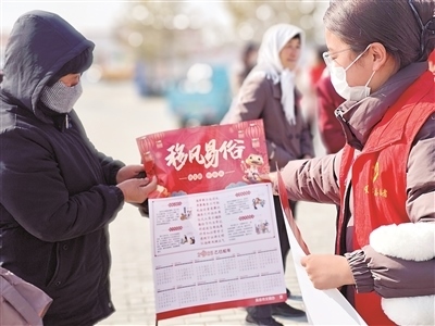 圖為寧夏鹽池縣青年志愿者給鄉(xiāng)親們發(fā)放移風(fēng)易俗宣傳單。