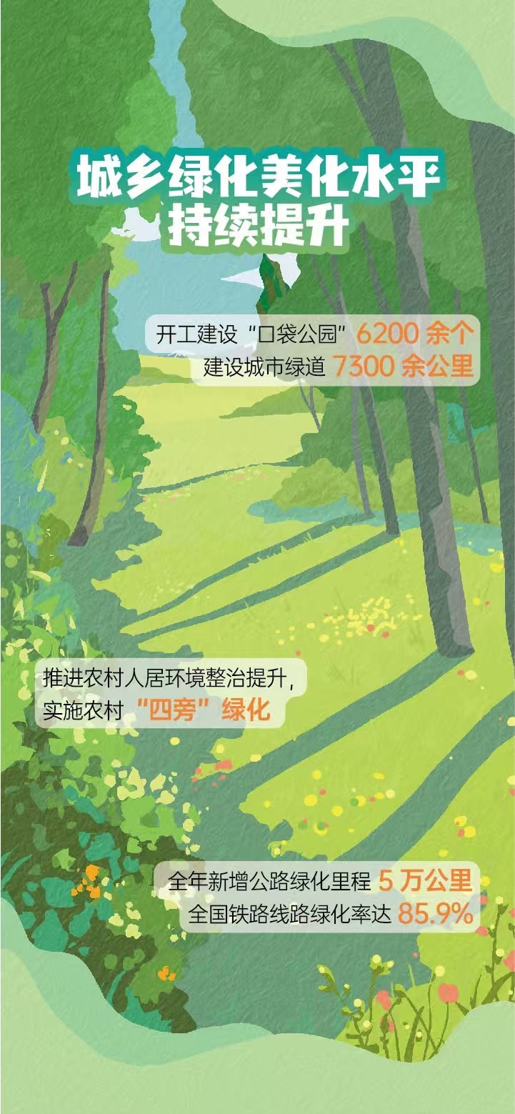 張利明介紹,過去一年,山水林田湖草沙系統治理取得新進展,城鄉(xiāng)綠化美化水平持續(xù)提升。組織實施176個“雙重”工程項目、10個國土綠化示范項目。推進實施“十四五”27個山水林田湖草沙一體化保護和修復工程項目、49個歷史遺留廢棄礦山生態(tài)修復示范工程項目。森林可持續(xù)經營實施面積擴大到66.7萬公頃以上。全國林草碳匯試點市(縣)和國有林場碳匯試點實施面積達6.8萬公頃。新增水土流失治理面積6.4萬平方公里。開工建設“口袋公園”6200余個,建設城市綠道7300余公里。新增公路綠化里程5萬公里,全國鐵路線路綠化率達85.9%。