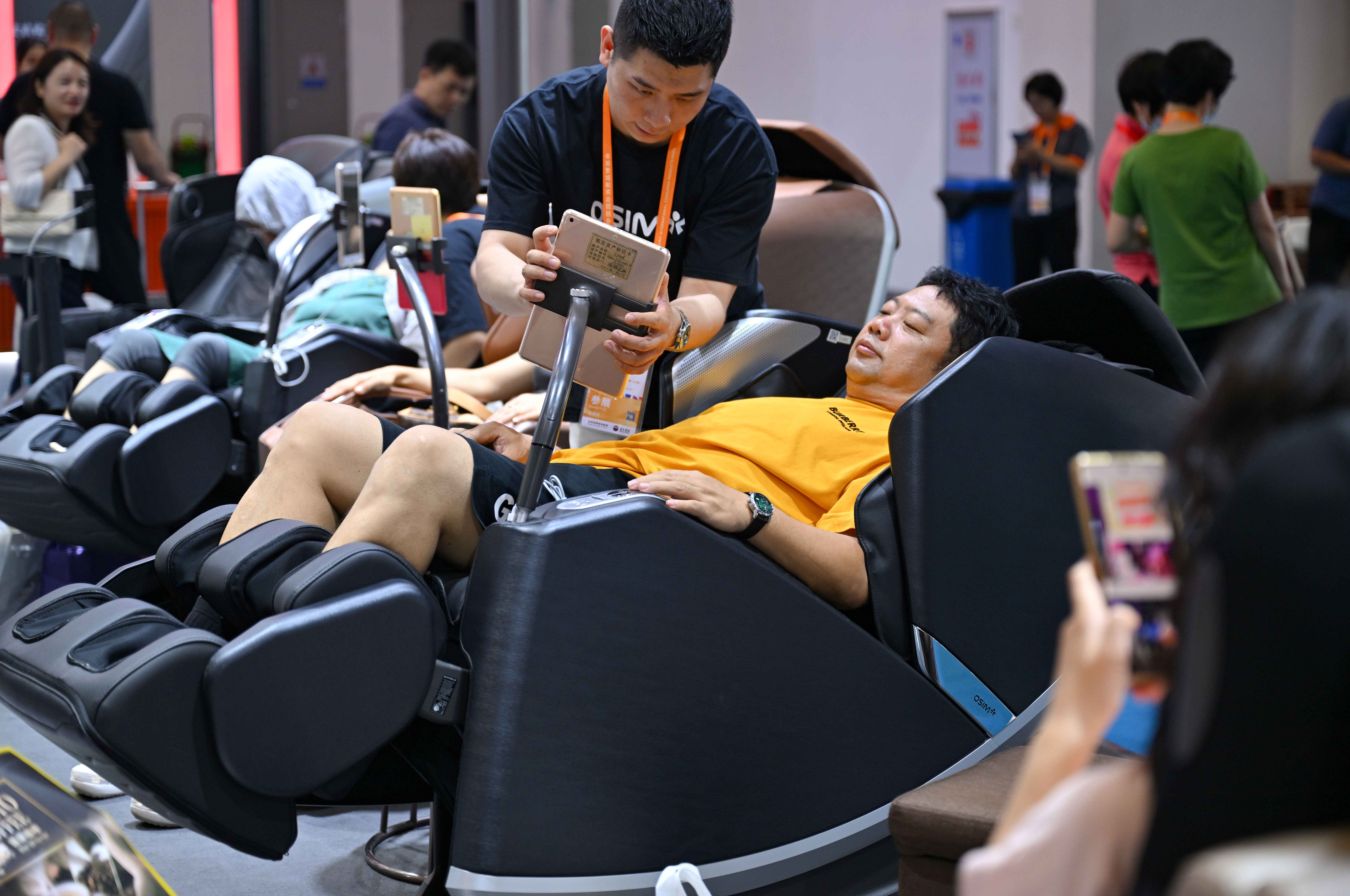 2024年4月17日,參觀者在第四屆消博會上體驗(yàn)傲勝按摩椅。新華社記者 郭程 攝