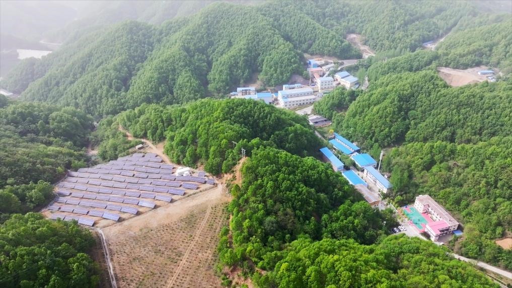 驅(qū)車駛入洛寧縣伏牛山區(qū),在紫金礦業(yè)集團旗下的洛陽坤宇礦業(yè)有限公司,已閉庫的尾礦庫上,光伏電板依山勢整齊排列,深藍色的面板與周邊翠綠的樹木交相輝映,科技感十足。