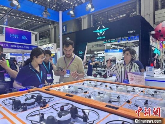 國(guó)外采購(gòu)商咨詢新型無(wú)人機(jī)。 記者 索有為 攝
