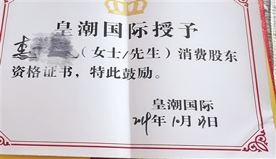 皇潮醫(yī)療美容為李女士頒發(fā)的消費(fèi)股東資格證書