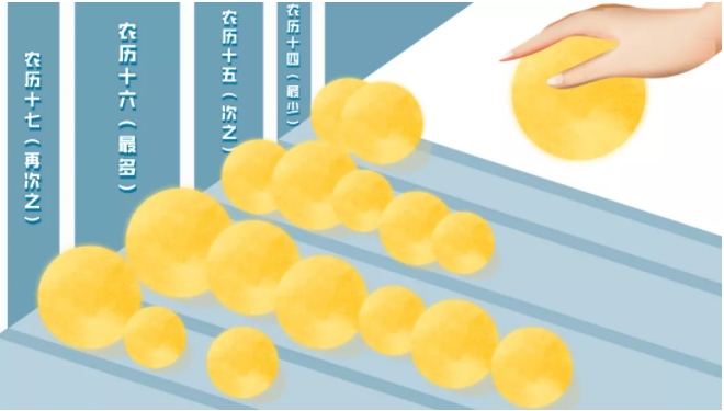 統(tǒng)計(jì)發(fā)現(xiàn),“滿月”出現(xiàn)次數(shù)最多的是農(nóng)歷十六,其次是農(nóng)歷十五,再次是農(nóng)歷十七,最少的是農(nóng)歷十四。
