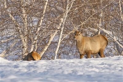 野生赤鹿來“蹭吃蹭喝”。