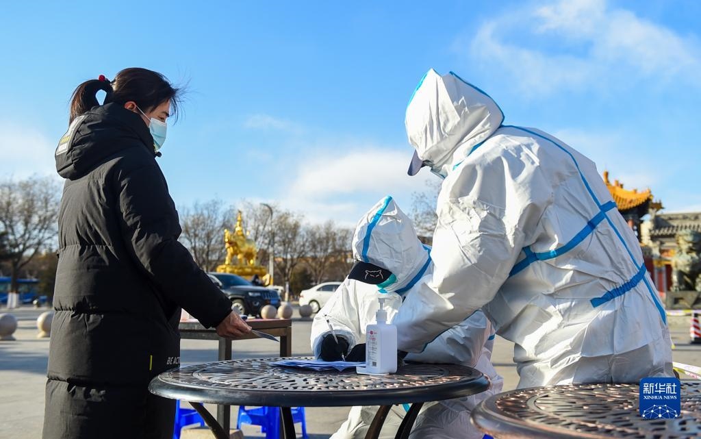 2月19日,在呼和浩特市玉泉區(qū)席力圖召臨時核酸采樣點,工作人員登記信息。新華社記者 彭源 攝