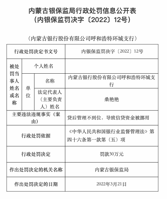 4月28日消息,據(jù)內蒙古銀保監(jiān)局行政處罰信息公開表顯示,內蒙古銀行股份有限公司呼和浩特環(huán)城支行因貸后管理不到位導致信貸資金被挪,被罰款30萬元。具體內容如下: