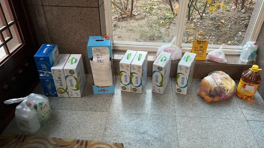 為了避免鄰居們錯拿或少拿物資,每天把物資搬運回單元門廳后,都會一一拍照標記戶號后發(fā)在居民微信群里,暖心地提醒鄰居們領取物資時一定要做好防護,消殺到位。