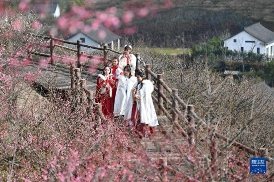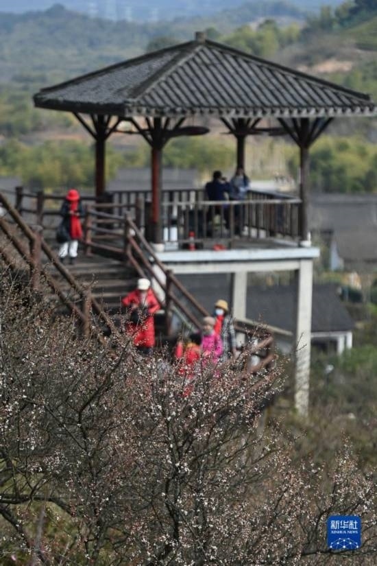 當日,西塞山第五屆梅花節(jié)在浙江省湖州市吳興西塞山旅游度假區(qū)原鄉(xiāng)小鎮(zhèn)景區(qū)開幕,盛開的梅花吸引不少游客前來觀賞。