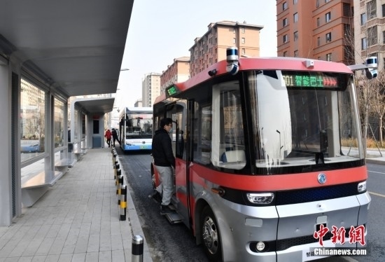 2月22日,智能網(wǎng)聯(lián)巴士901線測試車輛停靠公交站臺。雄安新區(qū)的智能網(wǎng)聯(lián)巴士近期正在進行投入運營前的道路測試,該巴士配備了超高感度攝像頭、超聲波雷達、激光雷達、毫米波雷達等感知設(shè)備,組成了車輛的“眼睛”。車輛可自主識別紅綠燈、道路提示牌和車道標線等,做出跟車、超車、停車等動作。中新社記者 韓冰 攝