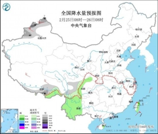 2月25日08時(shí)至26日08時(shí),新疆西北部、西藏南部、川西高原等地的部分地區(qū)有小到中雪或雨夾雪,其中新疆北部山區(qū)及伊犁河谷等地局地大雪(5~9毫米);四川西南部、云南中西部、西藏東南部、臺(tái)灣島等地的部分地區(qū)有小到中雨。新疆西北部、西藏中部、浙江、廣西南部等地的部分地區(qū)有4~6級(jí)風(fēng)。臺(tái)灣海峽有8~9級(jí)、陣風(fēng)10級(jí)的東北風(fēng),東海南部、南海有7~8級(jí)、陣風(fēng)9級(jí)的東北風(fēng)。