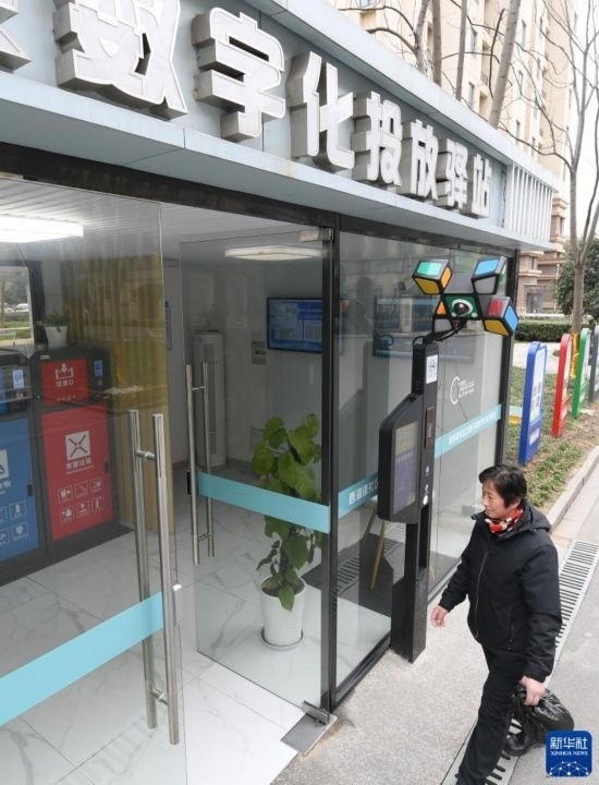 2月22日,在八里店鎮(zhèn)西湖漾社區(qū)垃圾分類數(shù)字化投放驛站,一位居民前來(lái)投放生活垃圾。