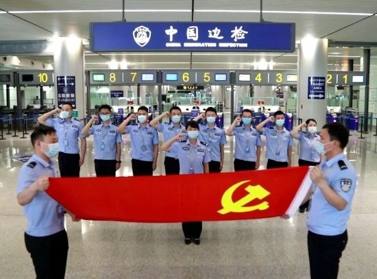 圖為孫偉帶領(lǐng)執(zhí)勤隊(duì)黨員移民管理警察開(kāi)展重溫入黨誓詞活動(dòng)。