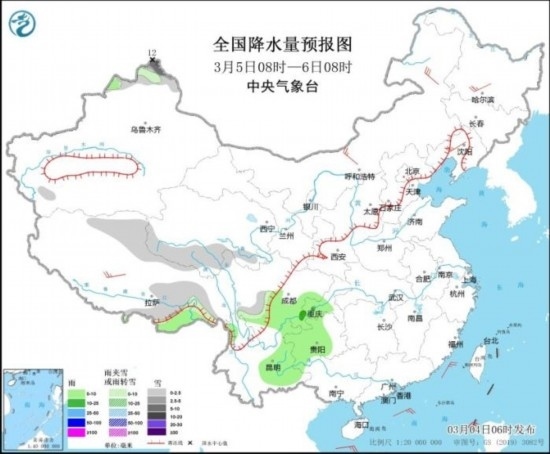 3月5日08時至6日08時,新疆北疆北部、西藏北部和東部、青海南部、川西高原南部等地部分地區(qū)有小到中雪或雨夾雪,其中,新疆阿勒泰等地局地有大到暴雪(10~12毫米)。四川東南部、重慶西南部、貴州中西部、云南東部等地部分地區(qū)有小到中雨。內蒙古中東部、黑龍江中部、吉林西部、遼寧西部、西藏中部等地部分地區(qū)有4~6級風。臺灣海峽、巴士海峽、南海大部海域將有6~7級風、陣風8級,其中南海東北部和西南部的部分海域風力可達8級、陣風9級。
