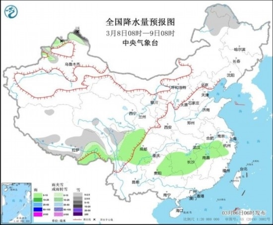 中新網(wǎng)3月6日電 據(jù)中央氣象臺(tái)網(wǎng)站消息,未來(lái)三天,四川南部和東部、貴州大部、重慶、云南東部、湖南中北部、湖北南部等地有小到中雨,局地大雨。受弱冷空氣影響,新疆西北部的部分地區(qū)有中到大雪或雨夾雪,局地有暴雪。內(nèi)蒙古東北部、黑龍江北部的部分地區(qū)有小到中雪或雨夾雪,局地有大雪。全國(guó)其余大部地區(qū)天氣晴好,氣溫逐漸上升。