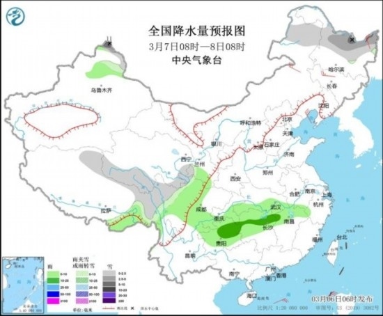 3月6日08時(shí)至7日08時(shí),新疆西北部、西藏北部和東部、青海南部、川西高原等地部分地區(qū)有小到中雪或雨夾雪,其中,新疆西北部等地部分地區(qū)有大雪(5~7mm);新疆西北部、西藏東南部、四川南部、重慶、貴州、云南東部、湖南西北部、湖北西南部等地部分地區(qū)有小到中雨,其中,西藏東南部局地有大雨(25~30mm)。內(nèi)蒙古中部、遼寧、山東半島等地部分地區(qū)有4~6級(jí)風(fēng)(見(jiàn)圖1)。