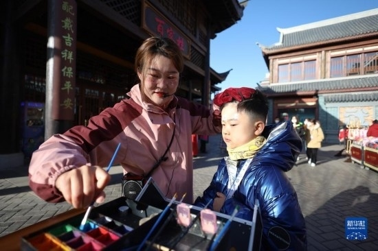 3月3日,在嘉峪關(guān)方特絲路神畫(huà)景區(qū),小朋友體驗(yàn)園區(qū)面部彩繪項(xiàng)目。