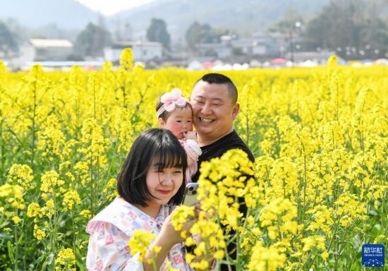 3月5日,在四川省崇州市道明鎮(zhèn),游客在油菜花田中觀光休閑。