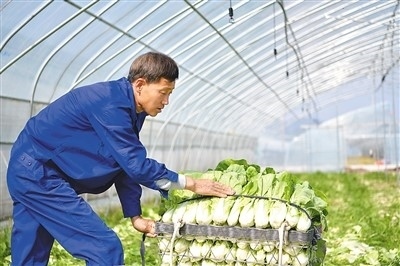 江西省上饒市鉛山縣通過“龍頭企業(yè)+村集體經(jīng)濟合作社+農(nóng)戶”模式,建設萬畝蔬菜基地,促進農(nóng)民增收。圖為3月6日,村民在鉛山縣永平鎮(zhèn)缸瓦窯萬畝蔬菜基地采收蔬菜。 丁銘華攝(人民視覺)