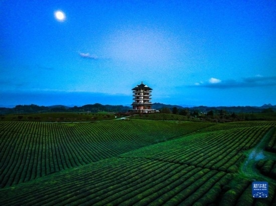 4月4日在遵義市湄潭縣永興鎮(zhèn)拍攝的月光下的“萬畝茶海”(無人機照片)。