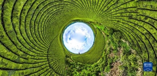 4月4日拍攝的遵義市湄潭縣永興鎮(zhèn)“萬畝茶?!保o人機全景拼接照片)。