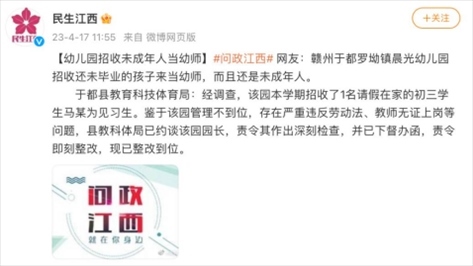 ·贛州于都縣一幼兒園招收初三學(xué)生為見(jiàn)習(xí)生,園長(zhǎng)被約談。