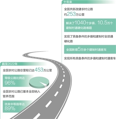 一條條“四好農(nóng)村路”修到村頭,通到了鄉(xiāng)親們的家門口。截至2022年,全國農(nóng)村公路總里程已達453萬公里,等級公路比例達96%。十年來,我國支持貧困地區(qū)新改建了6.5萬公里資源路、旅游路、產(chǎn)業(yè)路。