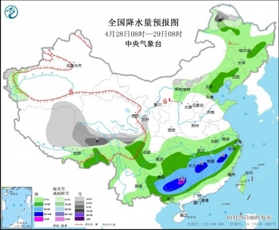 4月28日08時(shí)至29日08時(shí),內(nèi)蒙古東北部、黑龍江西北部、新疆南疆盆地西部、西藏北部和東部、青海南部和西部、川西高原北部等地部分地區(qū)有小到中雪或雨夾雪,其中,內(nèi)蒙古東北部、西藏東北部等地部分地區(qū)有大到暴雪(10~15毫米)。遼寧西部、西藏東南部、河北東北部、江南大部、西南地區(qū)東南部、華南北部和西部等地部分地區(qū)有中到大雨,其中,湖南東部、江西中北部、福建西北部、浙江西部、廣西北部等地部分地區(qū)有暴雨或大暴雨(100~120毫米)。內(nèi)蒙古中西部部分地區(qū)有4~6級(jí)風(fēng),陜西北部局地有7~8級(jí)風(fēng)。