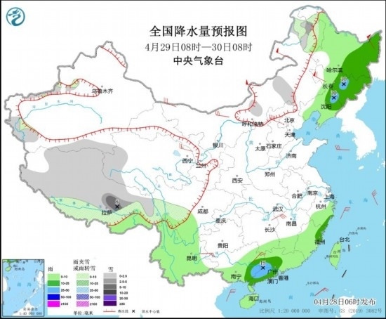 4月29日08時(shí)至30日08時(shí),內(nèi)蒙古東北部、新疆南疆盆地西部、西藏大部、青海西部、川西高原南部等地部分地區(qū)有小雪或雨夾雪,其中,西藏東南部等地部分地區(qū)有中到大雪(5~8毫米)。東北地區(qū)大部、江南東部和南部、華南大部、臺(tái)灣島等地部分地區(qū)有小到中雨,其中,吉林東部、遼寧北部、廣西東部、廣東中西部等地部分地區(qū)有大雨(25~45毫米)。內(nèi)蒙古中北部、黑龍江東北部、青海東部、江西北部、貴州西南部、廣西東北部等地部分地區(qū)有4~6級(jí)風(fēng)。