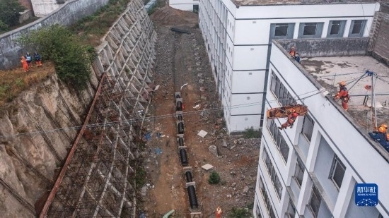 消防救援人員在進行模擬山體垮塌救援演練(5月11日攝,無人機照片)。