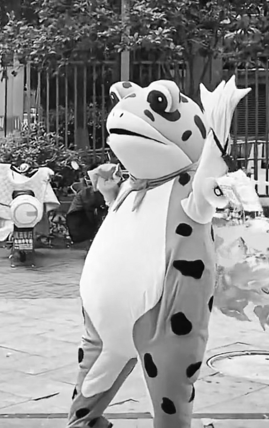 讓童女士沒想到的是,第二次穿著青蛙人偶服出去“賣崽”就引發(fā)大量關(guān)注,“賣崽青蛙”在路人視角隨手拍攝的視頻中火了。
