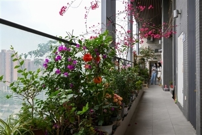 ■ 在這面美麗的花墻背后,是小區(qū)開(kāi)發(fā)商和樓棟240戶(hù)人家,共同打造出的花草童話——由開(kāi)發(fā)商種植的三角梅在交房時(shí)一并移交給業(yè)主,業(yè)主在門(mén)口的公共空間打造屬于自己的“小花園”。10年時(shí)間過(guò)去,240戶(hù)居民打造出了32層高的三角梅,還有繡球、蝴蝶蘭、多肉等綠植,櫻桃樹(shù)、桃樹(shù)、葡萄藤等水果植物,花椒、大蒜、番茄、西蘭花等蔬菜。