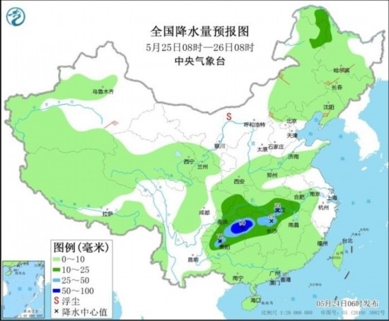 全國降水量預(yù)報(bào)圖(5月24日08時(shí)-25日08時(shí))