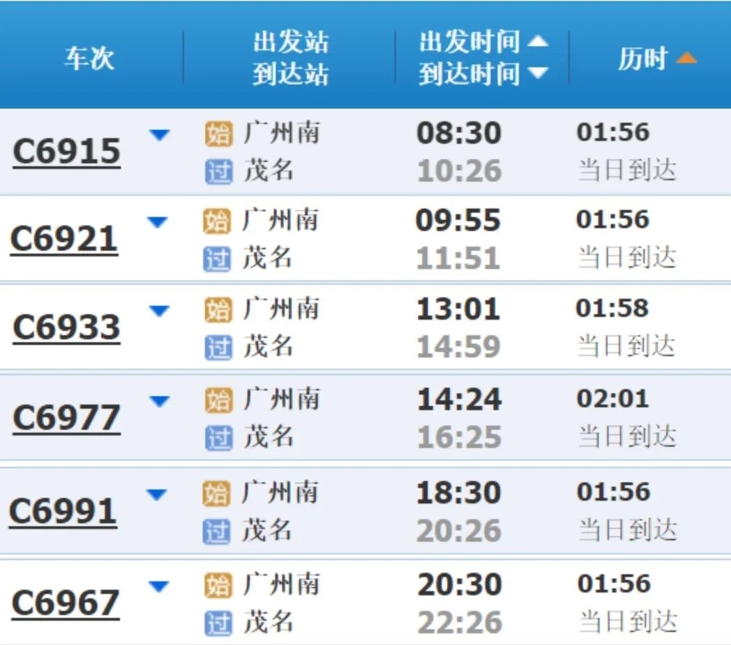 廣州南站至茂名直達車: