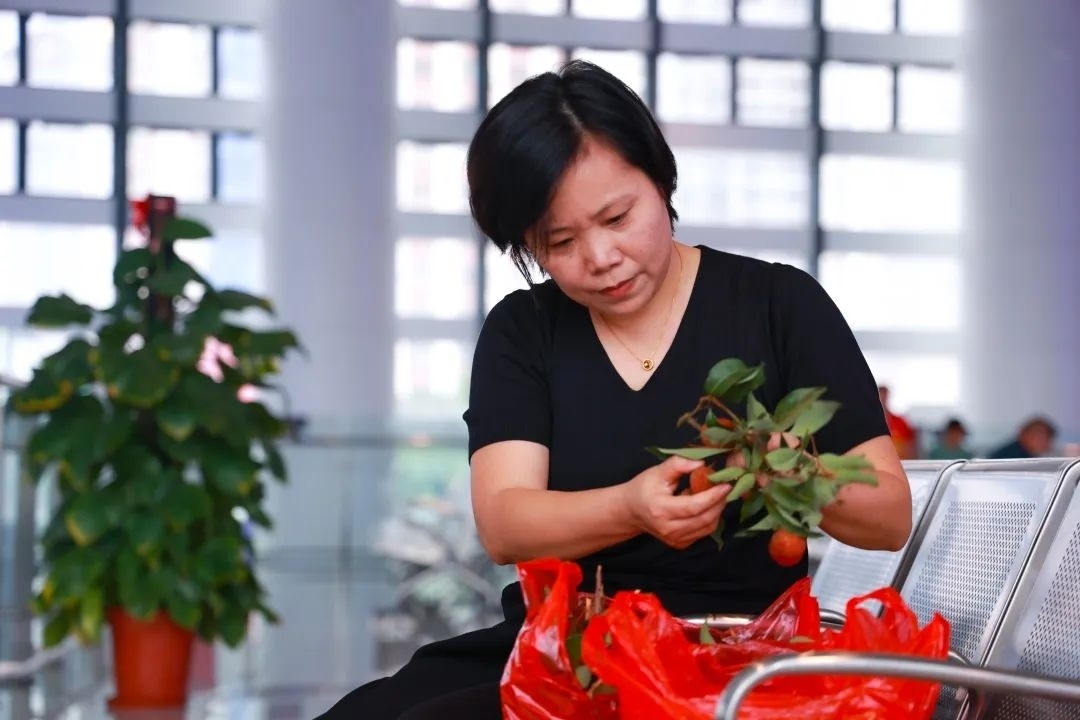 寬敞明亮的候車室內(nèi),旅客蘭海英正利用候車時間打理剛買到的荔枝。她是從廣州到茂名出差,看到有新鮮荔枝上市,馬上買了12斤白糖罌。