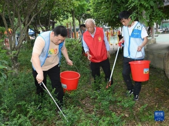 5月29日,在湖州市環(huán)渚街道玉堂橋社區(qū),凌法林(中)帶領殘障人士參與到社區(qū)日常保潔工作中。