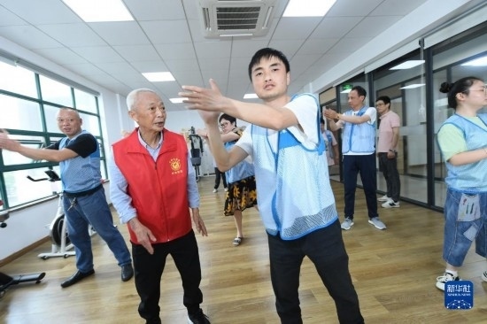 5月29日,在湖州市環(huán)渚街道玉堂橋社區(qū),凌法林(左二)帶領殘障人士做操。