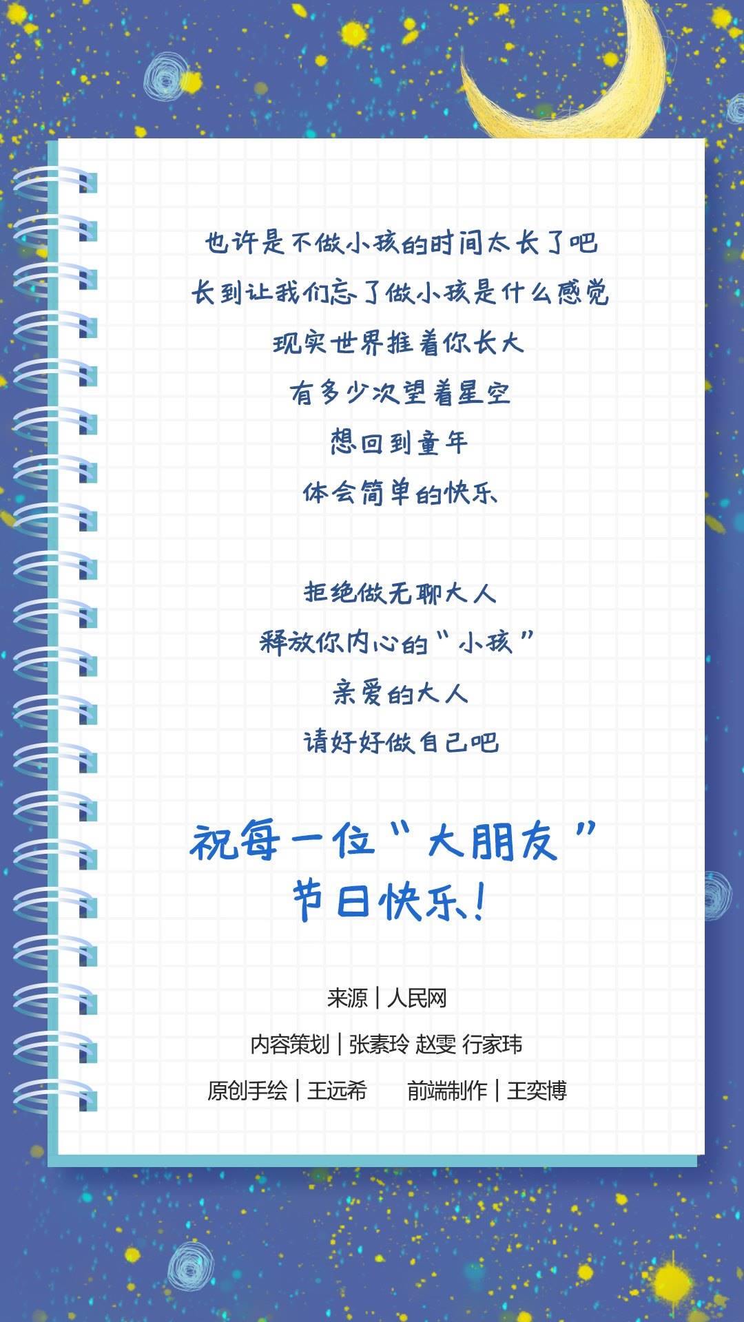 也許是不做小孩的時(shí)間太長(zhǎng)了吧,長(zhǎng)到讓我們忘了做小孩是什么感覺(jué)?,F(xiàn)實(shí)世界推著你長(zhǎng)大,有多少次仰望星空,想回到童年,體會(huì)簡(jiǎn)單的快樂(lè)。拒絕做無(wú)聊大人,釋放內(nèi)心的“小孩”,親愛(ài)的大人,請(qǐng)好好做自己吧!祝每一位“大朋友”節(jié)日快樂(lè)!