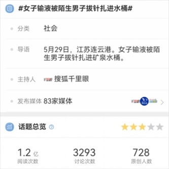 據(jù)微信號“網(wǎng)信連云港”6月1日消息,近日,一條涉連云港“女子輸液被陌生男子拔針扎進(jìn)水桶”的新聞,引發(fā)多家媒體轉(zhuǎn)載報道,相關(guān)話題沖上各大平臺熱榜。
