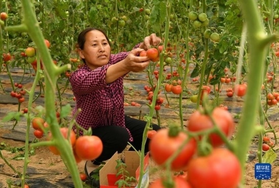 6月4日,農(nóng)民在獻(xiàn)縣河城街鎮(zhèn)梅莊洼農(nóng)場大棚內(nèi)采摘西紅柿。