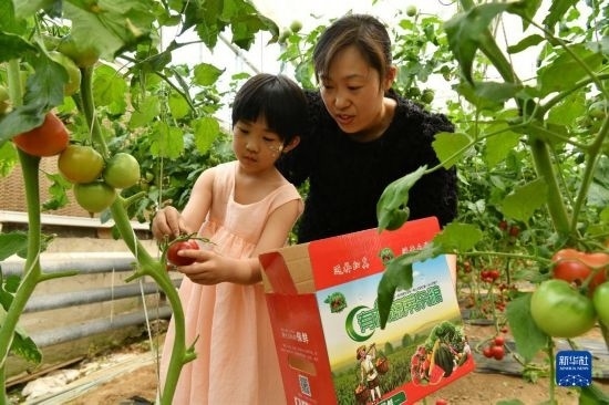 6月4日,游客在獻(xiàn)縣河城街鎮(zhèn)梅莊洼農(nóng)場大棚內(nèi)采摘西紅柿。