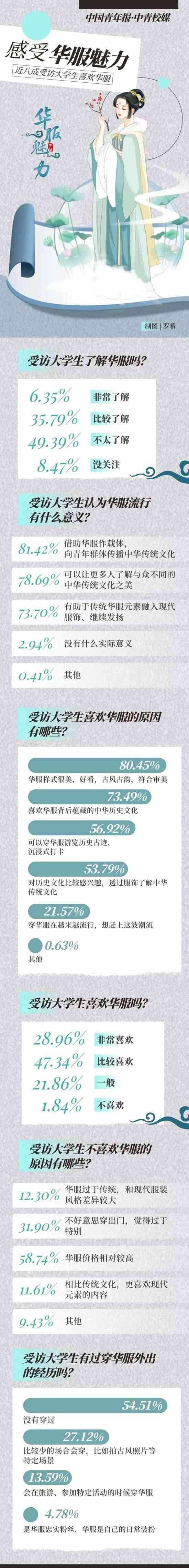 穿華服正在成為一些年輕人旅游或日常出行的選擇?!叭A服”,是指具有中華民族歷史文化基因、精神風(fēng)貌,且融合當(dāng)代審美的禮儀性服裝,其服裝風(fēng)格根植于中華傳統(tǒng)文化,傳承中華民族特質(zhì),體現(xiàn)當(dāng)代社會積極向上的時代精神,具有鮮明的辨識度,適用于國際交往、文化交流、商貿(mào)往來以及日常節(jié)慶、典祭等禮儀場合。自2018年起,每年的農(nóng)歷三月初三被選定為“中國華服日”,在前不久結(jié)束的第五屆“中國華服日”活動中,上萬名青年華服愛好者匯聚活動現(xiàn)場參與體驗。近日,中國青年報社·中青校媒面向全國高校大學(xué)生發(fā)起問卷調(diào)查,共回收117所高校學(xué)生填寫的有效問卷1464份。調(diào)查結(jié)果顯示,76.30%受訪者表示喜歡華服,42.14%受訪者表示對華服有一定的了解。
