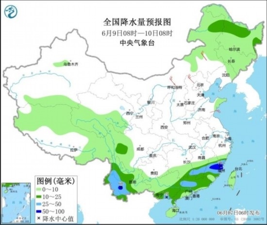 6月9日08時(shí)至10日08時(shí),內(nèi)蒙古東北部、黑龍江北部和東部、江南中東部和南部、西南地區(qū)西南部、華南大部等地的部分地區(qū)有中到大雨,其中,福建中北部、云南西南部等地局地有暴雨(50~70毫米)。內(nèi)蒙古中部、河北北部等地的部分地區(qū)有4~6級(jí)風(fēng)(見(jiàn)圖3)。