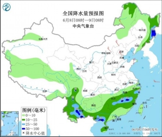 7-9日,江南、華南、云貴高原、四川南部等地有中到大雨,局地有暴雨,小時(shí)雨量20-50毫米,局地可達(dá)60毫米以上;華北、黃淮、東北地區(qū)等地有陣雨或雷陣雨,局地伴有雷暴大風(fēng)或冰雹等強(qiáng)對(duì)流天氣,中央氣象臺(tái)6月7日06時(shí)發(fā)布強(qiáng)對(duì)流天氣藍(lán)色預(yù)警。