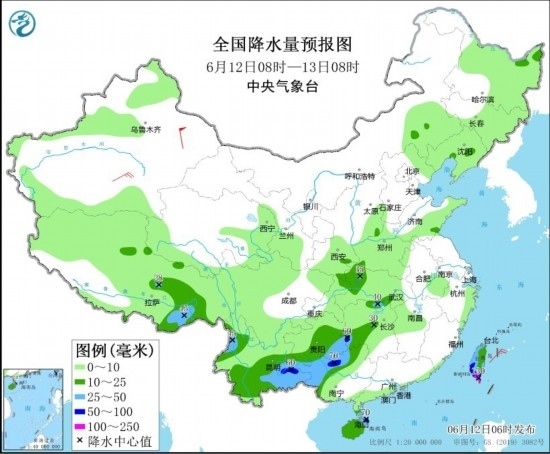 6月12日08時(shí)至13日08時(shí),貴州南部、云南東南部和西北部、廣西北部、海南島東北部、臺(tái)灣島大部、湖北中部、西藏東南部等地部分地區(qū)有中到大雨,局地暴雨或大暴雨(50~130毫米)。新疆中北部和東部、內(nèi)蒙古中部等地部分地區(qū)有4~6級(jí)風(fēng)(見圖2)。