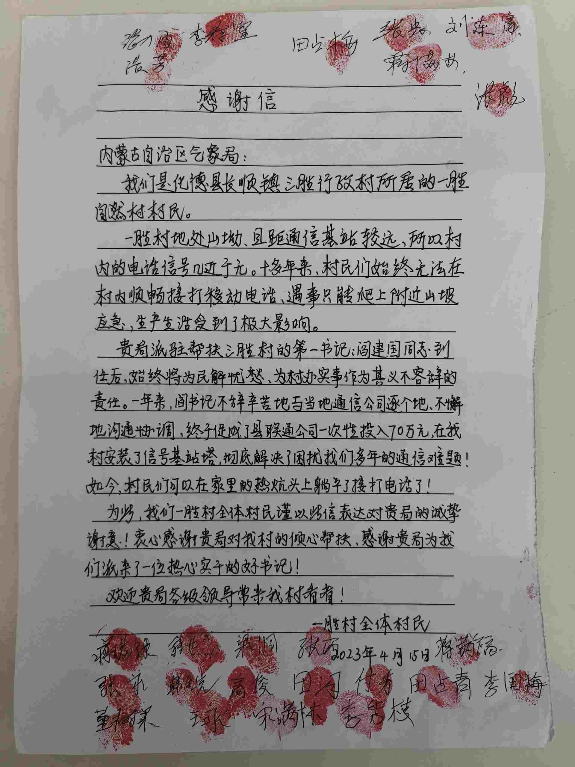 近日,一封署名為“一勝村全體村民”的感謝信,被專(zhuān)程送至內(nèi)蒙古氣象局,信紙上的空白處簽滿(mǎn)了24個(gè)名字,還有一枚枚鮮紅的指印,這封信承載著烏蘭察布市化德縣一勝村16戶(hù)村民對(duì)駐村第一書(shū)記閻建國(guó)的誠(chéng)摯謝意。