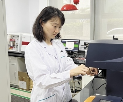 南京市產(chǎn)品質量監(jiān)督檢驗院綠色可降解材料質檢中心副主任朱南幫企業(yè)做測試實驗。蔣若晗攝