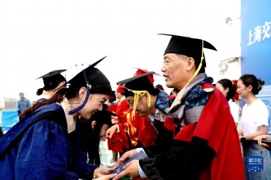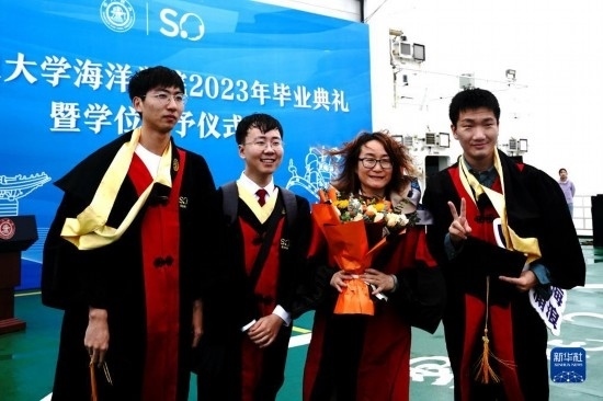 當(dāng)日,上海交通大學(xué)海洋學(xué)院2023年畢業(yè)典禮暨學(xué)位授予儀式在“雪龍2”號上舉行,70余名畢業(yè)生在甲板上與師長道別?!把?”號是我國自主建造的第一艘極地科學(xué)考察破冰船。